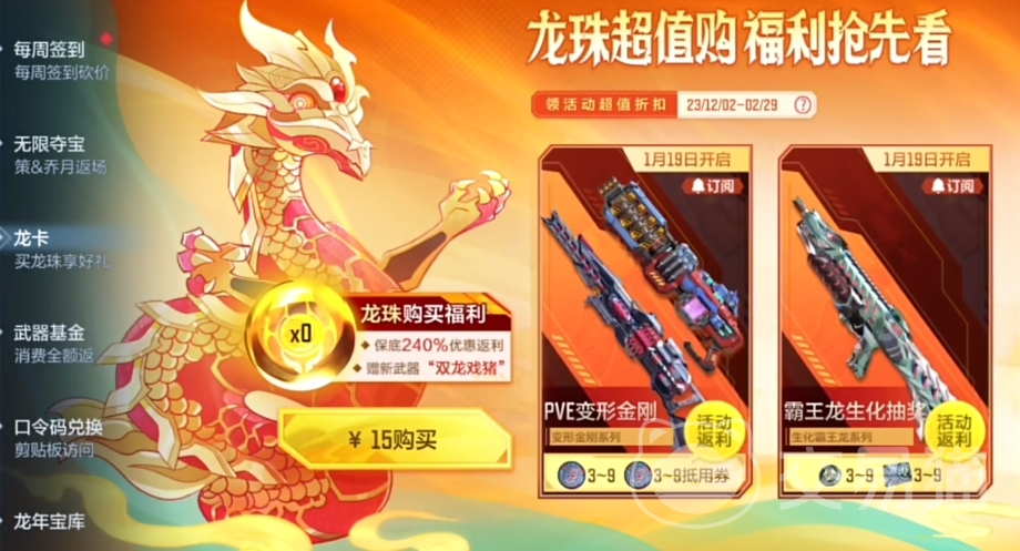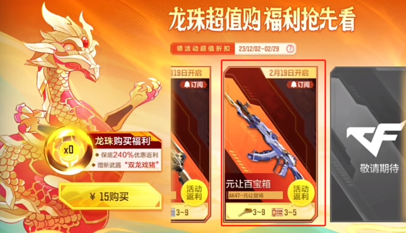 其次就是这个龙珠超值购的福利了,里面拥有黑龙诸神黄昏套转,另外一个就是大家所期待的百宝箱了,具体的开启日期是在2月19日,也就是说大家还有很长的时间能够好好的去准备,里面主要就是有元这款武器,整体的数据也对得起一线武器的效果了。