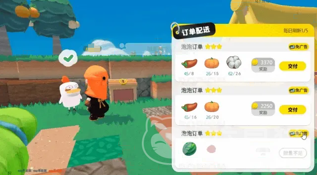 庄稼成熟了,靠近一点就能轻松采摘,注意自己的包包得有位置哦。收获的农作物可以找家园里的心灵鸡聊天,他可是个订单配送小能手,完成泡泡订单,就能轻松赚取金币了!