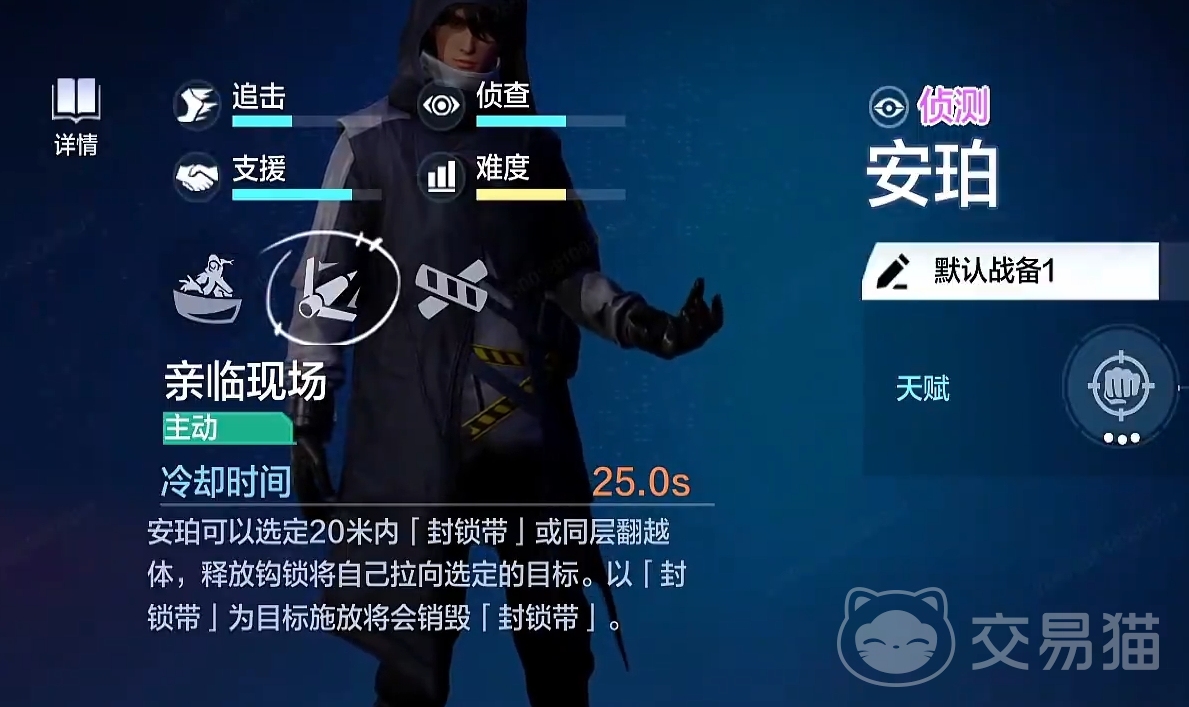 亲临现场,冷却时间25秒,效果为角色可以指定以自身为中心,20米范围内任一个封锁带或者同楼层的翻越体,释放钩索将自己拉向选定目标,以封锁带为目标,释放则会销毁封锁带。非常强大的位移技能,可以配合一技能的封锁带,实施一个快速的场景转移,或者直接勾翻越体来进行快速移动,追捕敌人非常好用。