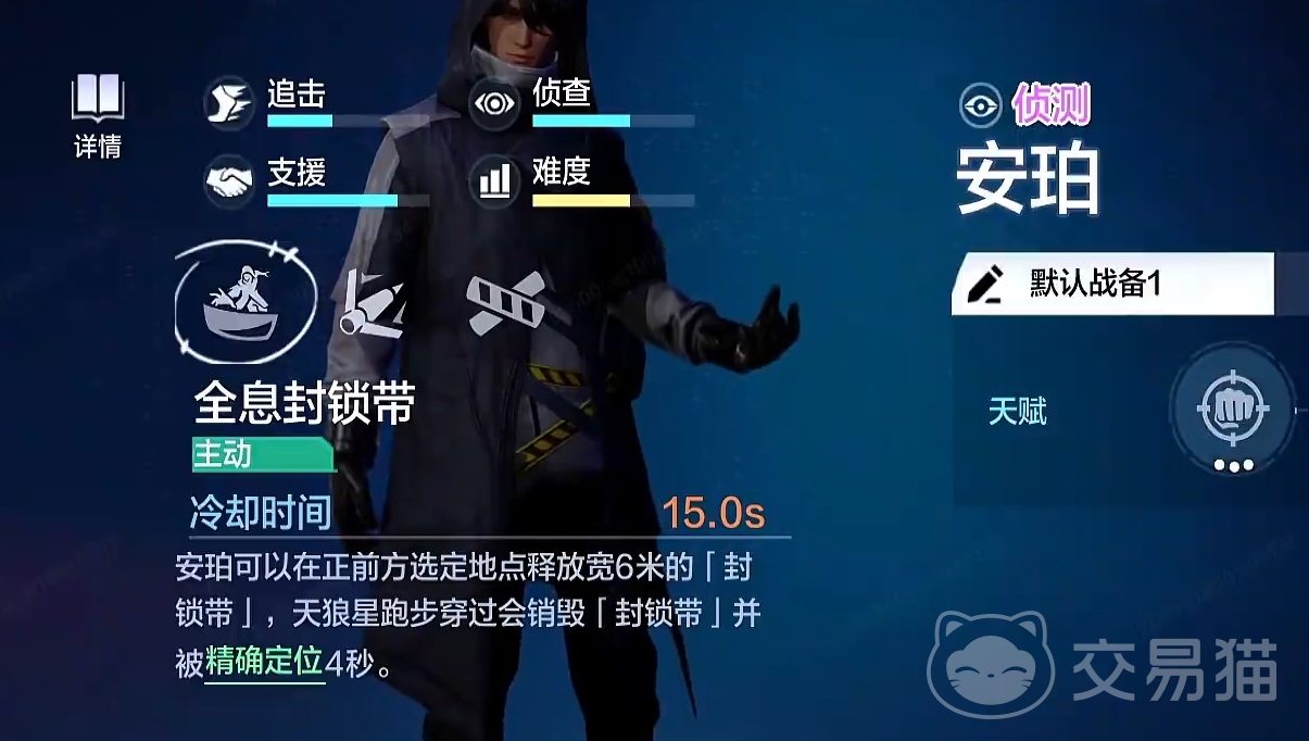 角色的实战强度很高,但也并不是说完全就没有应对方法,他的一技能封锁带在放置的时候,如果敌人不跑动,而是采用一个慢走伪装状态下穿过的话,那么则不会被触发警报精准封锁。但这一定程度上也延缓了天狼星行动的速度和活动的轨迹,使得我们能够更加精确的对目标进行一个延迟抓捕。