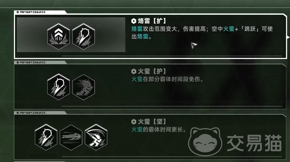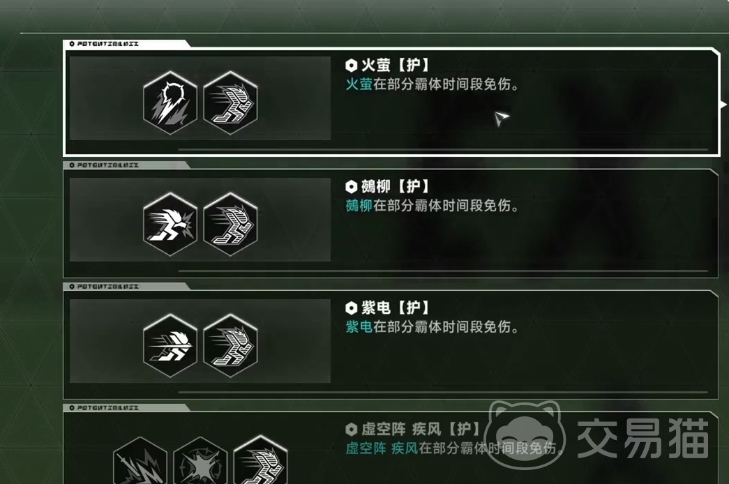 首先便是最值得各位新手使用的护系列潜能组合,包括火萤护,紫电护等等,他们能够让我们角色在部分霸体时间段获得高额的免伤效果,能让我们在释放技能的时候更加容易保存状态,提升我们的生存几率。