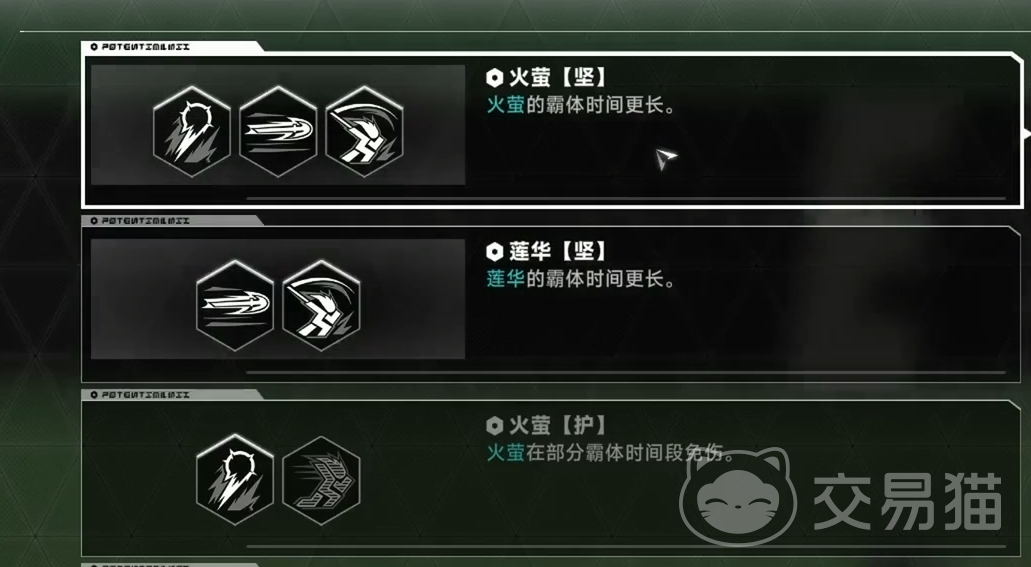 另外就是坚系列,它能够让我们的霸体时间更长。与前面的户搭配起来,能让我们在更多的时间内获得更多的霸体和减伤效果。特别是对一些主流玩火萤的玩家而言,两者几乎是必须搭配的选择。