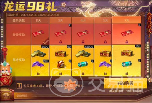 ”龙运98礼”每日登录就能领到福利券的奖励,这个券可以用来去抽典藏的服装,将这个解锁之后,还能够得到返利,最高8倍。”新春点睛图”活动,只要完成任务,就能将点睛图升级,领取对应奖励,时装,载具,宠物礼盒等着大家。”瓜分现金红包”活动,邀请幸存者回家就能够分红包。