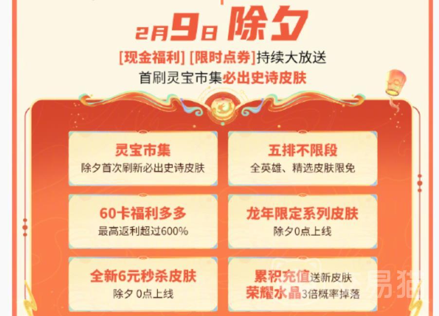 在2月6号的时候,会上线新英雄熬隐。2月7号的时候会有灵宝集市,可以得到史诗级别的皮肤,运气好的话还能得到传说皮肤冠军飞将。此外新春期间还会上架60卡,只要参加就能获得不少的皮肤抵扣卷,可以用来购买新年限定皮肤。