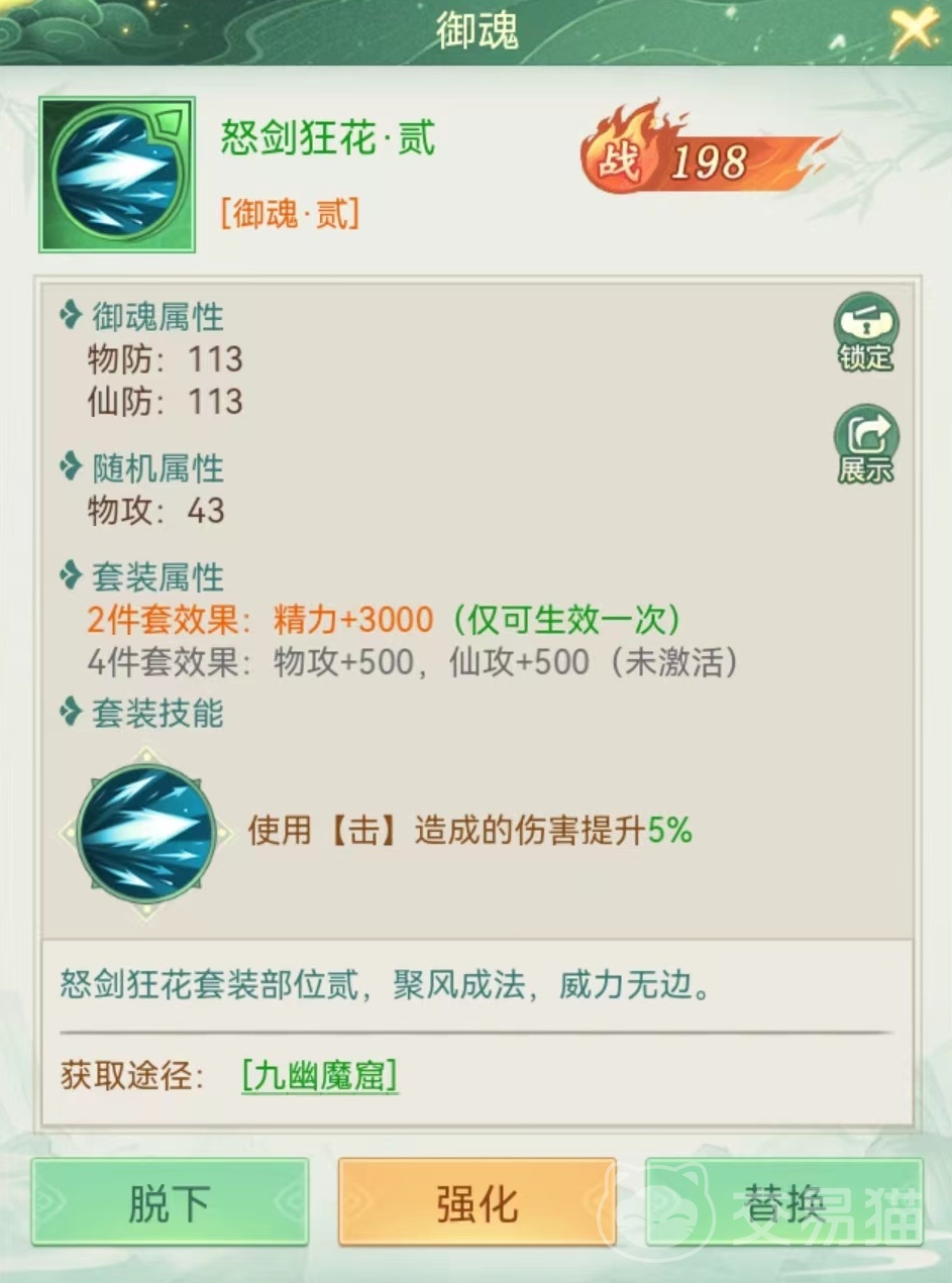 看到这里大家应该就清楚仙剑奇侠传新的开始怒剑狂花怎么样了吧,很多新手玩家现在忽略了御魂套装的重要性,这是非常不合适的,只需要简单去挑战一下九幽魔窟,获取到套装之后先给人物装备上,战力会提升很多,后续可以在逐渐更换。