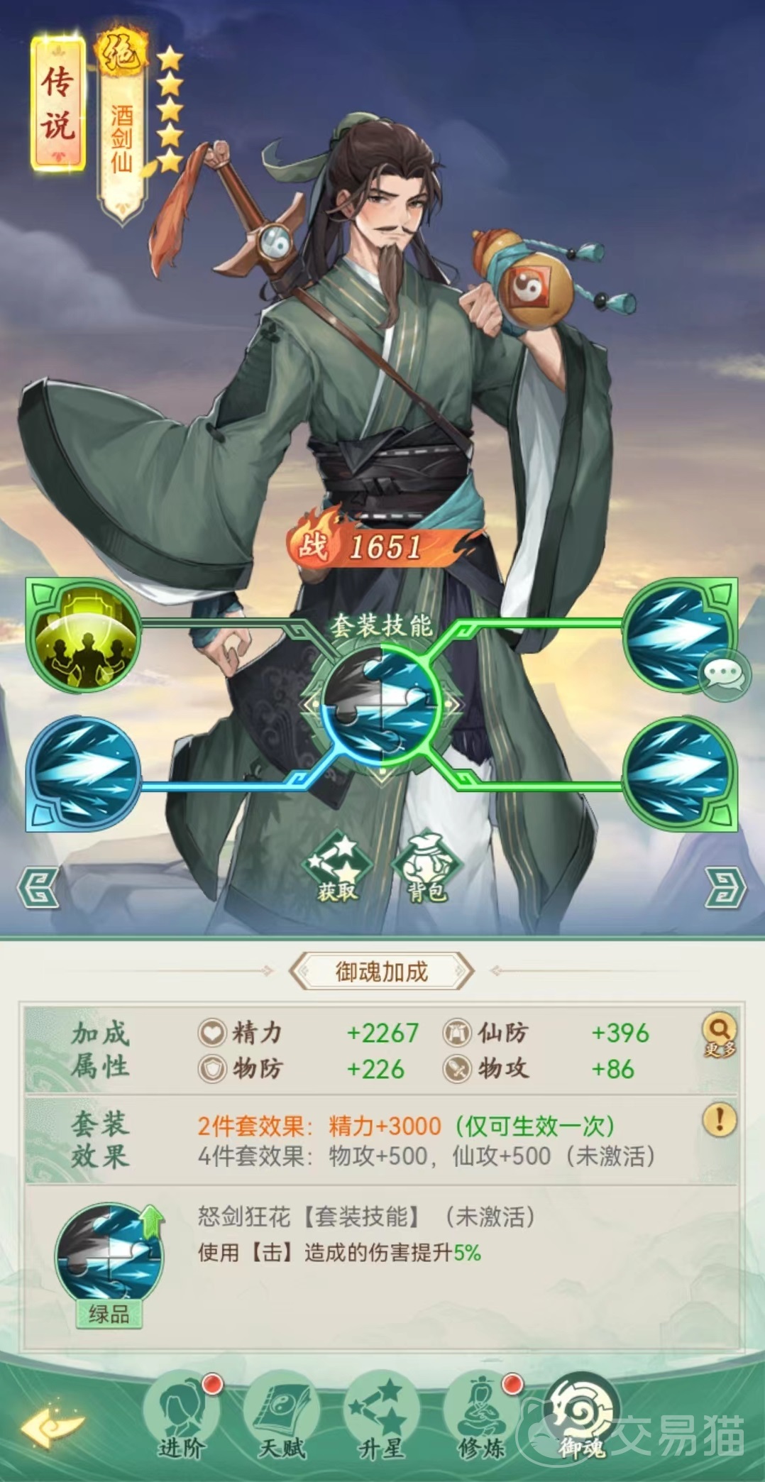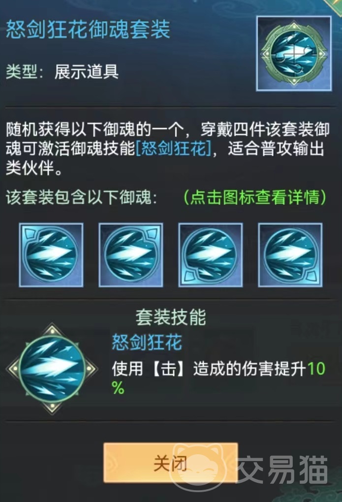 装备四件套时可以激活最佳套装技能,如果达不到这样的数量,就只能发挥出各自优势,而无法带来套装技能,两件套也可以起到初步套装效果。怒剑狂花就是现在大家非常喜欢使用的一个御魂套装,在达到两件套时效果为提高精力,四件套时能够增加角色物攻和仙攻,另外还有套装技能,使用普通攻击时造成伤害提高。如果是橙色品质,最多能提高到25%。从技能效果就可以看出,怒剑狂花适合那些依靠普攻来打出输出的角色。