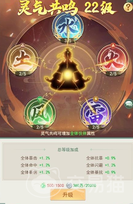 大家都知道游戏中的每个角色都拥有自己的五行属性,这个属性除了可以在战斗过程中实现相互克制之外,在灵气共鸣系统中也是很重要的设定。当主角达到55级,开服10天以后,就可以体验到灵气共鸣系统。位置就在于新出现的登仙台中,需要获取通宝和天灵气来激活灵气共鸣,根据属性去进行强化,点击强化之后,所有属于该属性的伙伴都可以享受到额外加成。