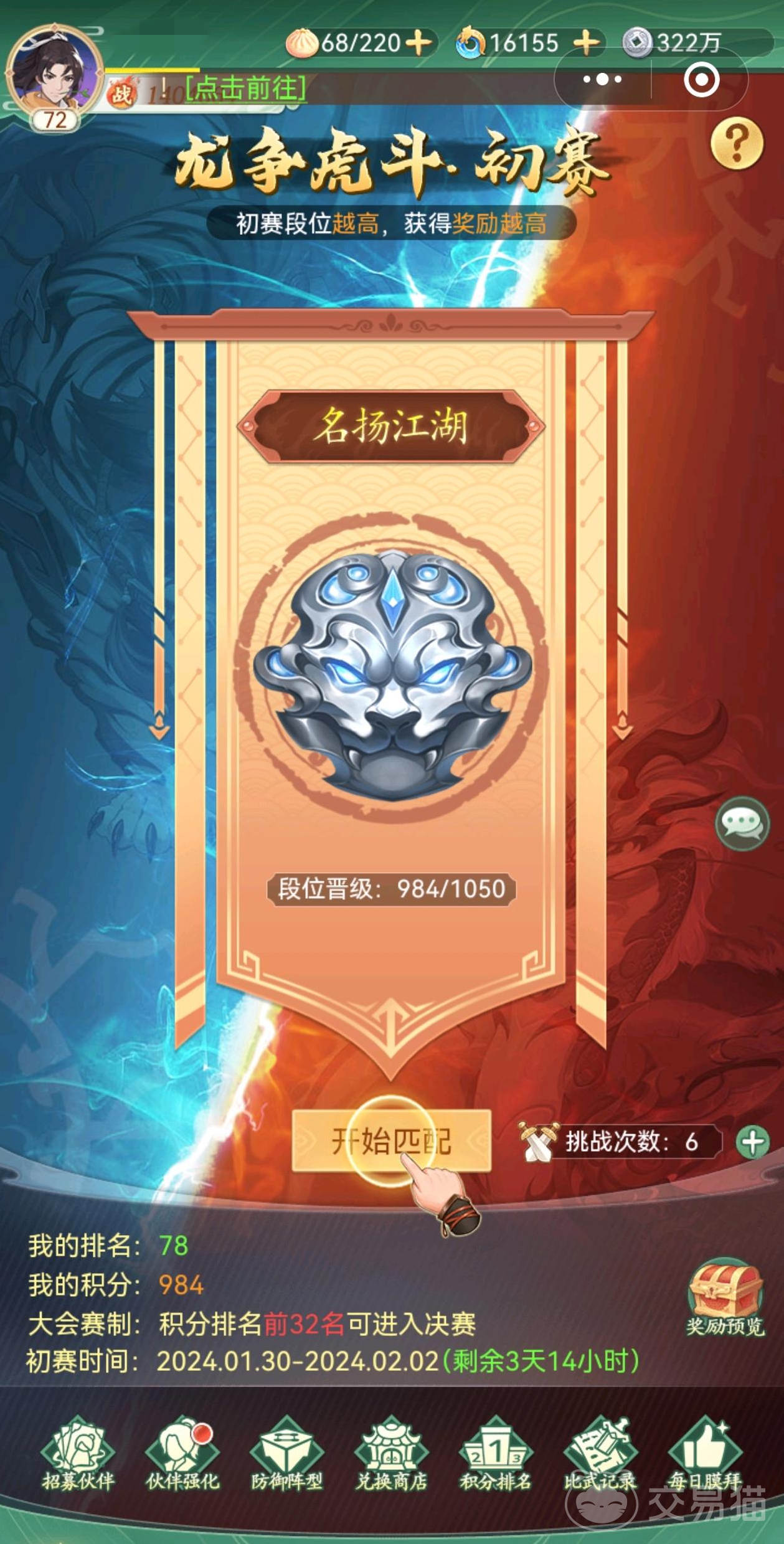 在玩家等级达到50级之后,在冒险中的历练选项中就可以打开龙争虎斗活动。这项活动的最主要意义就是让大家可以全面体会各种卡牌用法,可以搭配出自己心仪阵容。在众多活动中,这项是氪金影响最小的一项,当然并不是说氪金毫无作用,只是在活动中技术上优势要比氪金更加重要。即使是零氪玩家,也可以追求在同段位里的高排名,这样奖励也会很丰厚。