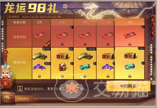 【龙运98礼】这个活动属于一个返利类的活动,玩家们登录的话,可以免费领取【福利劵】奖励,而且在活动期间,也就是2月2号到2月16号这个时间段,玩家们随时可以购买龙运98礼,购买后,就可以领取额外的登录奖励了,这些奖励中包含了大量的基金奖励,而且七天的话,就可以享受到8倍的返利!需要玩家们花费98元人民币来进行购买!