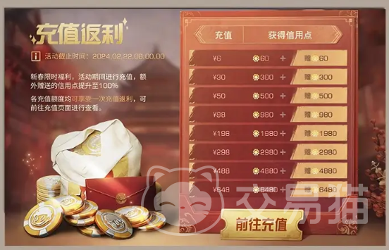 在活动期间还更新了【充值返利】玩法,活动时间2月2号到2月22号期间,玩家们充值的话,是可以额外获得100%的信用点数的,通过计算的话,几乎是可以半价拿下商城中的时装,非常值得大家去入手!最后一个活动是有关新服活动的!游戏中会更新一个简单生存服专服,玩家们通过活动页面去进行预约的话,是可以领取到限时易容卡和新款家具的!