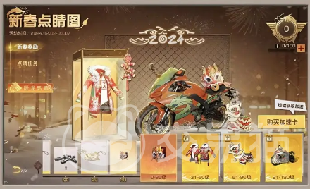 【新春点晴图】这是游戏中一个升级玩法,玩家们只需要完成点睛任务,升级点睛图的话,就可以免费领取更多的新春头饰,而且这个玩法是可以购买加速卡的,可以更快速的解锁这些奖励,可以获得时装【铁柱和二丫】【噼里啪啦】挂饰,头饰【龙龙纸箱头】,以及载具【飞爪青龙】和【来福宠物】礼盒!
