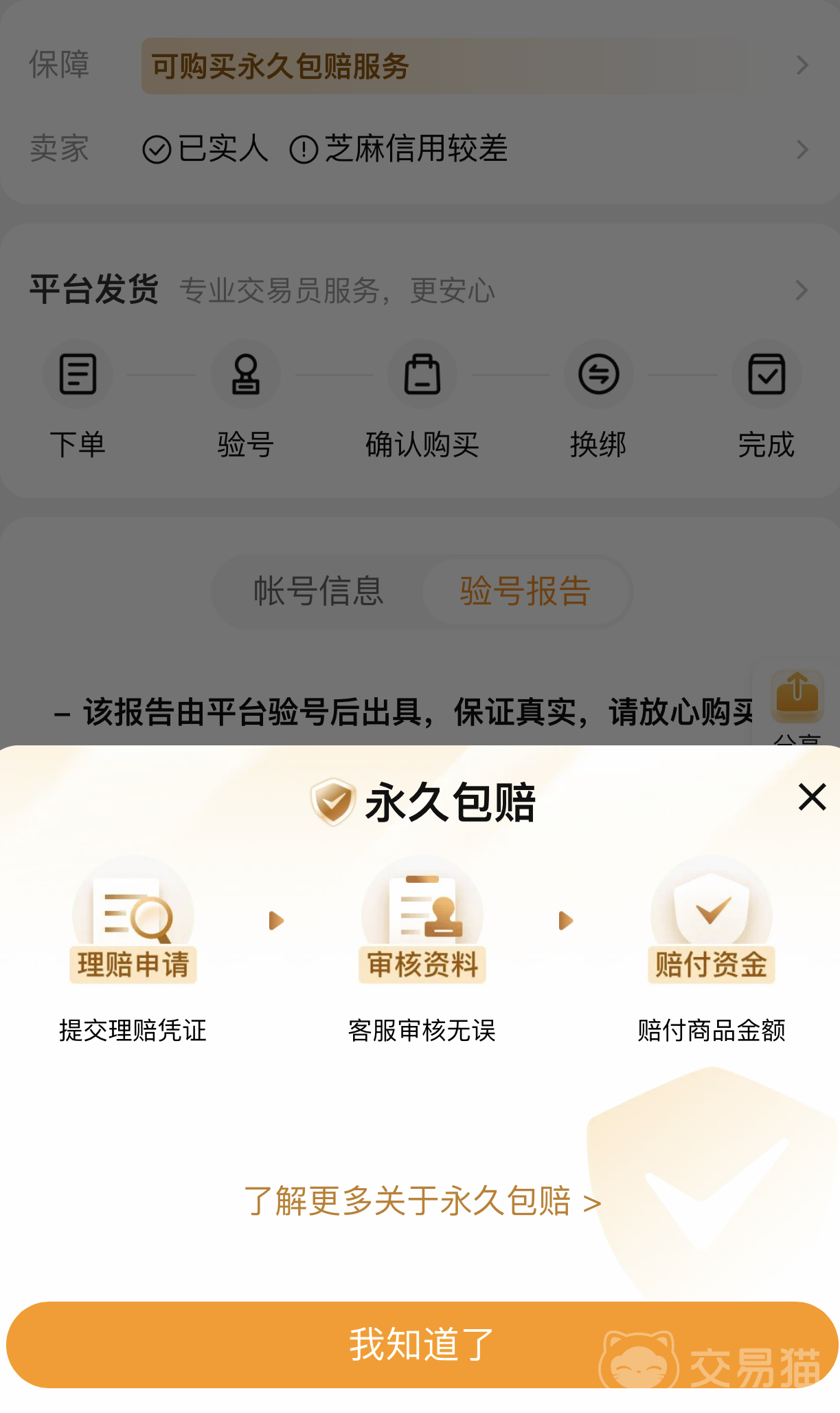 如果账号被盗号或者找回的话,就会对买家造成损失,并对卖家也有一定的困扰。所以为了杜绝这种情况出现,平台还支持永久包赔,出现问题可获得赔付。卖家们可以为买家们买一份,从而提升买家们的信任度,让他们可以更放心购买。当然没有的话,买家也可以自己选择购入一份。
