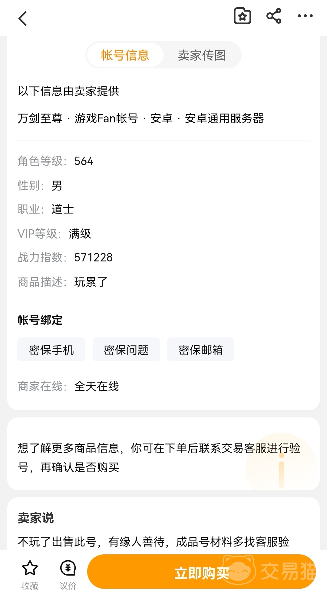尤其像万剑至尊这种比较火爆的账号在各大平台的需求量都比较大,再加上交易猫平台本身活跃的用户就比较多,这样出售账号的成功率也就无形当中增加了,进入专区之后的各种账号商品链接当中包含的信息十分详细,验号报告、客户端、游戏部分截图、部分装备截图等内容都有。