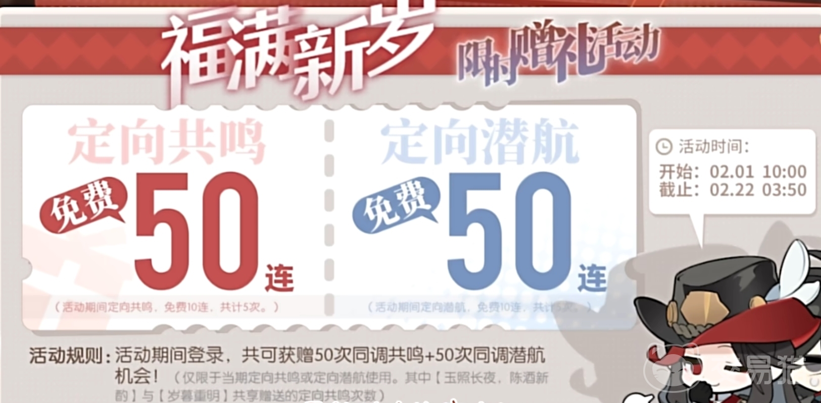 同时,随着角色的登场,还会时装新烙痕Ssr的失途之日,以及sr的团圆。这两个烙痕可能是对于双风的激励,让风队补强一波。另外还有福满金岁的限时赠礼活动,随着每天的登录,可以在活动时间内一直领取到大量的免费十连卷。每一个都有50发,可以抽定向角色和定向烙痕。