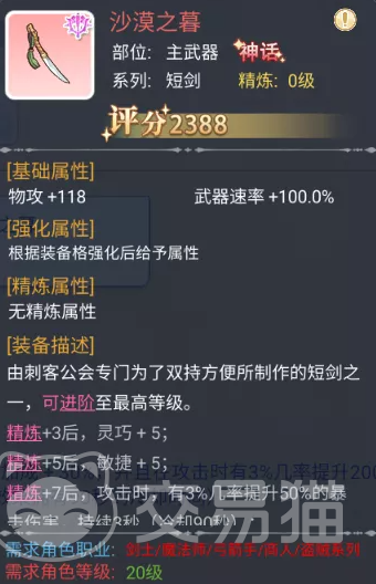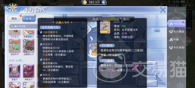辅助武器可以选择沙漠暮风组合套装,搭配这个套装的时候切记不要使用大剑或者是单手剑。至于其他的橙色的暴击类型卡片,可以考虑三个哥布林卡。要是想提高暴击数值的伤害可以选择给自己的主武器搭配流氓卡,这个卡满星的时候能够有15%的暴击加成。