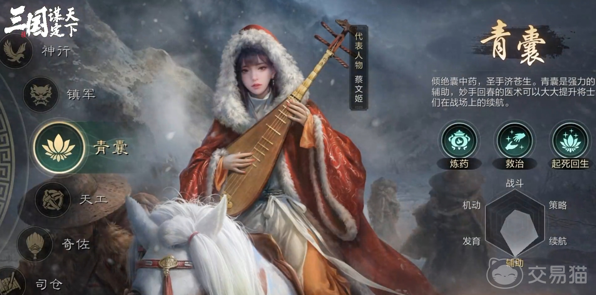 在本作游戏当中,青囊这个职业最大的特色在于卓越的辅助和续航效果。倾绝手中之药,来救济苍生。她能够为我们在战场上提供长时间的续航以及治疗效果,其天赋炼药所获得的丹药,能为盟友提供可观的基础治疗,恢复武将的体力值,保证我们前期的发育速度和容错率。