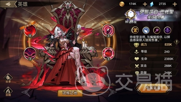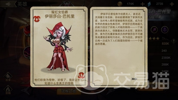 她的全名是“伊丽莎白·巴托里”,被称为“猩红女伯爵”,在游戏中是一位5星神话角色,而且比较少见的鬼牌,定位持续型伤害的法师,也就是队伍中的输出位。