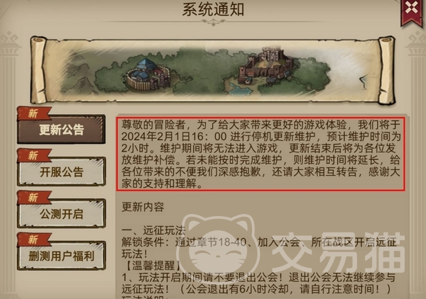除此之外,大家每次登录游戏可以留意下【系统通知】,如果有更新在【更新公告】那一栏会列出这次更新的详细内容。进击的骑士最近一次更新就是在2024年的2月1日,这次更新实装了“远征玩法”。