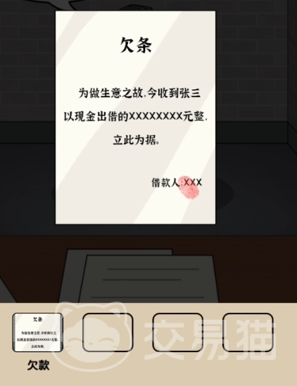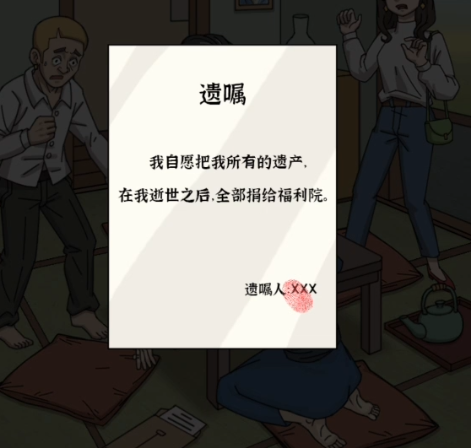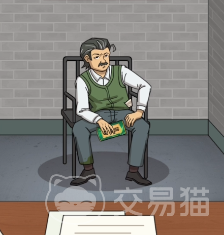 然后我们移动到桌子的右上角,在右上角那里我们可以看到桌子上有一个死者所写的三字。之后我们移动到死者的脚边,发现脚边有一份文件,点开一开是死者生前所遗留下的遗嘱。基本上现场的资料就这么多了,我们移动到监牢去查看几位嫌疑人的情况。