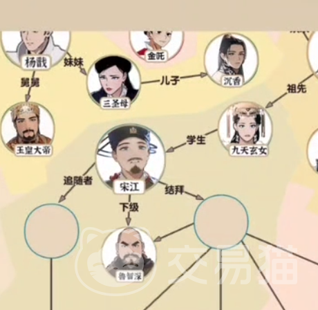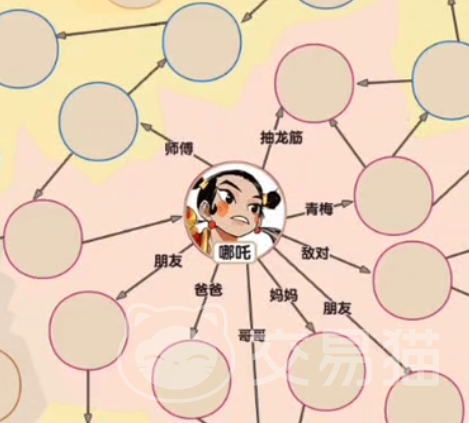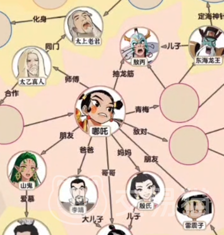 我们一上来出现的人物只有一个哪吒。我们可以看到哪吒附近的关系表还是很杂的,我们可以先选择他最近的几个位置,首先他的师傅是太乙真人,然后他的朋友有雷震子和山鬼。之后我们在父母上填写李靖和殷氏。哪吒的兄长是金吒和木吒,这点不要弄错。