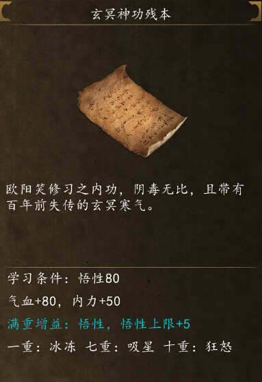玄冥神功是在几百年前欧阳笑研习的一个内功,该内功功法比较阴毒,功法里面附带着玄冥寒气,所以具有一重冰冻的效果,在打斗的时候能够有效的对敌人进行控制。