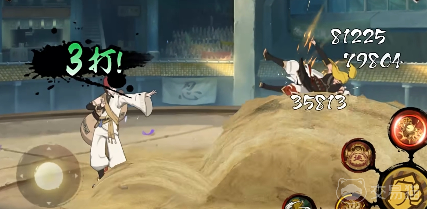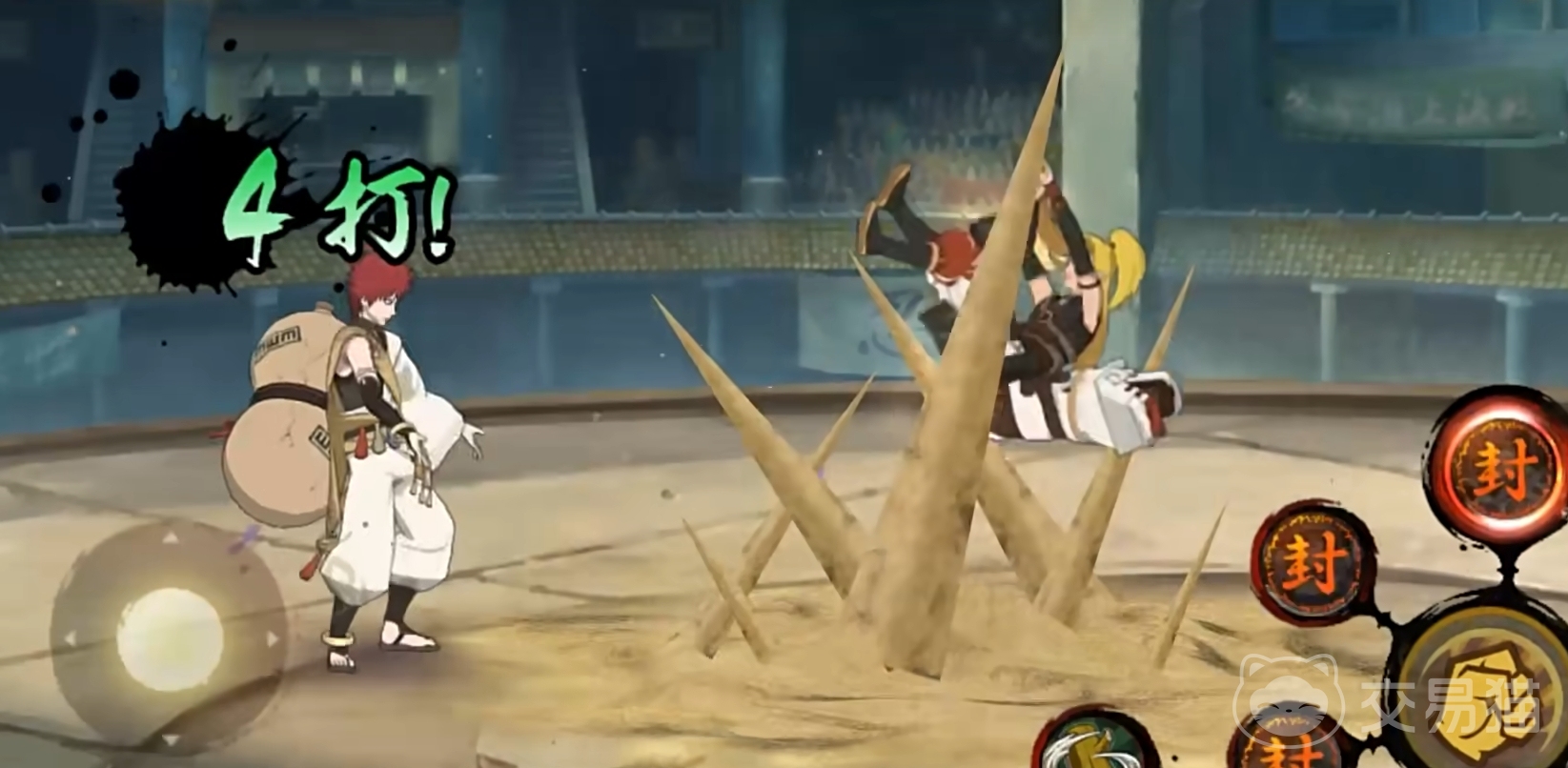一技能,总共有两段。第一段可以控制沙堆向前推并阻挡飞行物对敌人造成伤害,第二段短按时可以将敌人拉到身前,为之后的连招做准备,长按的话则可以自由控制沙掌方向,阻挡飞行物的同时释放后向前大力推沙掌。