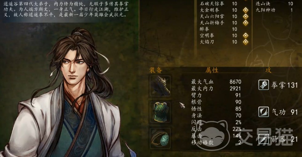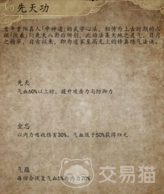 这个功法有一个“坐忘”的效果,可以用内力吸收30%的伤害,10重的回复是每回合回气血5%内力20%,效果非常给力。综合来看还是比较推荐给大师兄,搭配上投名状可以堪称铁血防御。当然如果你觉得萧复比较脆皮,那么也可以将先天功给他。