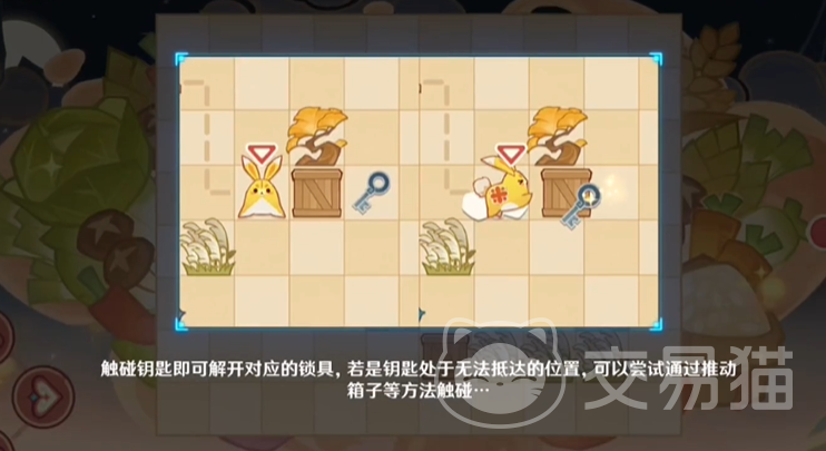 第三个关卡叫做【海错锁醇美】。这一关比较难,我们需要先让锅巴前往钥匙所在的地方,然后原路返回开始推箱子,接着推着箱子来到最终的障碍处,将箱子推进去,才能获得最终的食材“鱼肉”。这一关的通关步骤是“左下下右右左左上上右”,回到起点之后“右下下右右右左左下下”。