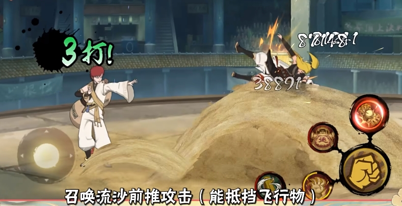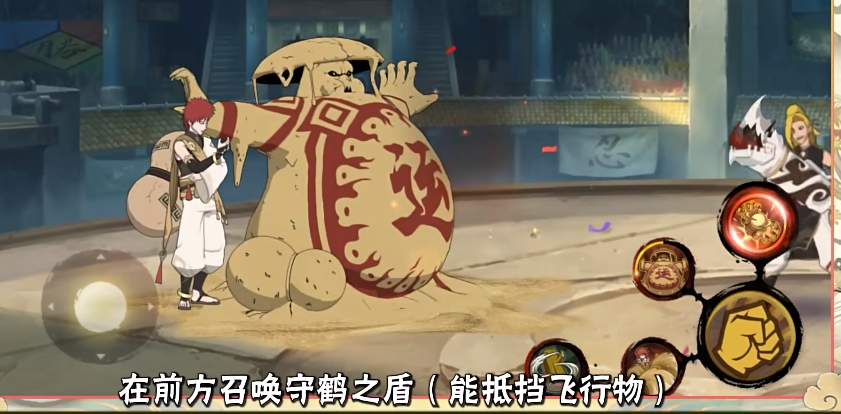 第二段则有两种释放方式,第一种是短按,短按的情况下,流沙会变成一个沙掌将敌人拍回来,方便我爱罗后续对其衔接近战连招。第二种则是长按,长按释放第二段的话则会生成一个更大的沙掌,这期间可以配合移动摇杆来自由控制沙掌的移动,以此伤害敌人并抵挡不同方向的飞行物。