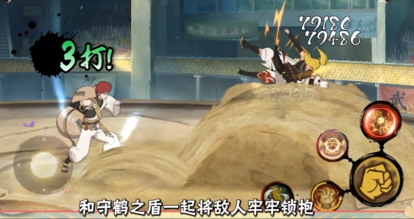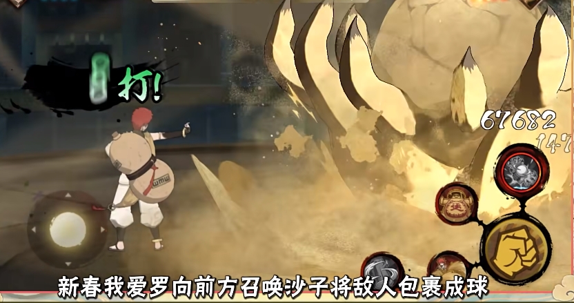 组合技是“沙画之术”,一技能施放第一段流沙击飞敌人后立刻施放二技能会召唤一个无法移动的守鹤之盾,此时再短按一技能二段将会重新生成流沙将敌人迅速拍回到我爱罗身前,以此与守鹤之盾形成两面夹击。夹击过后我爱罗还会引爆流沙,以此绘制出一副大头照形式的年兽特效。