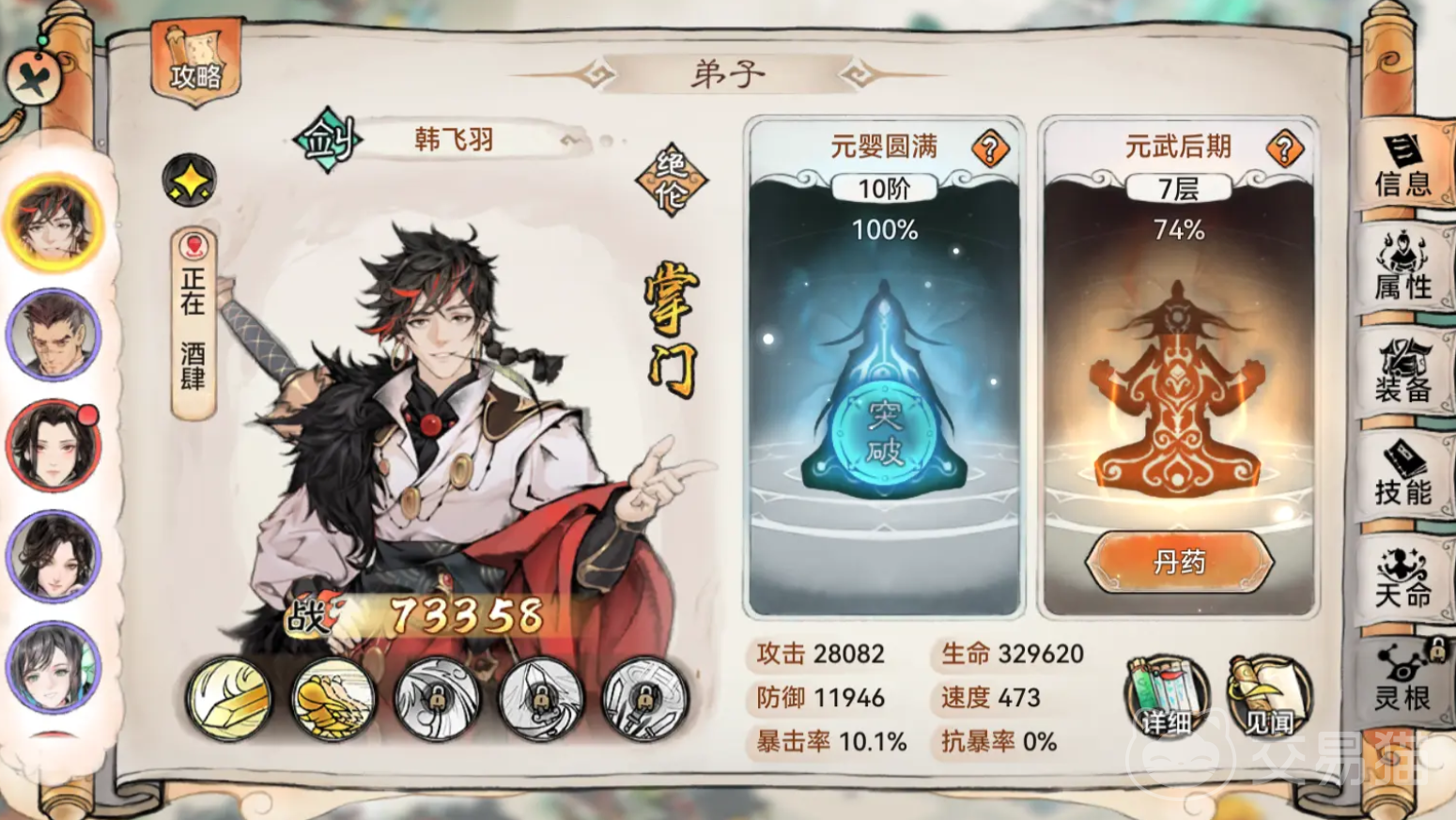 韩飞羽的初始属性在弟子团当中不算很高的,所以大家如果想要让韩飞羽的输出最大化,需要提升韩飞羽的潜力。我们需要给韩飞羽装备上增加潜力的玉符,这样韩飞羽的强度才能在线。然后在每次战斗之前,可以让韩飞羽去坊市买酒喝,更能大幅度提升韩飞羽造成的伤害。