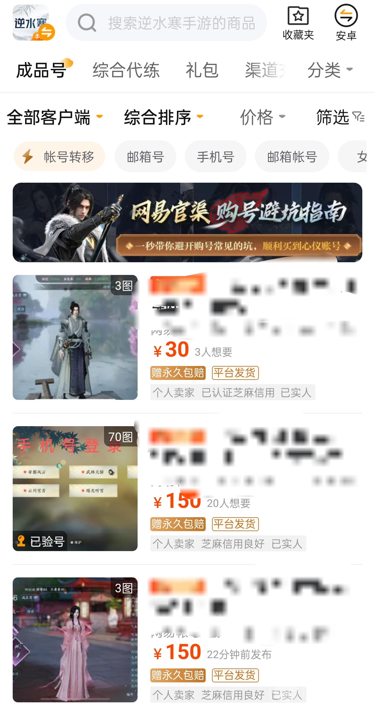 交易猫作为国内领先的账号交易平台,拥有海量的逆水寒手游成品号资源。无论您是需要购买高战力号、高充值号还是其他类型的账号,交易猫都能满足您的需求。在这里,您可以轻松找到心仪的账号,省去了在各大论坛、群聊中苦苦寻找的时间和精力。相信你可以在琳琅满目的账号资源中找到你心仪的那一款并开启你的游戏之旅吧!