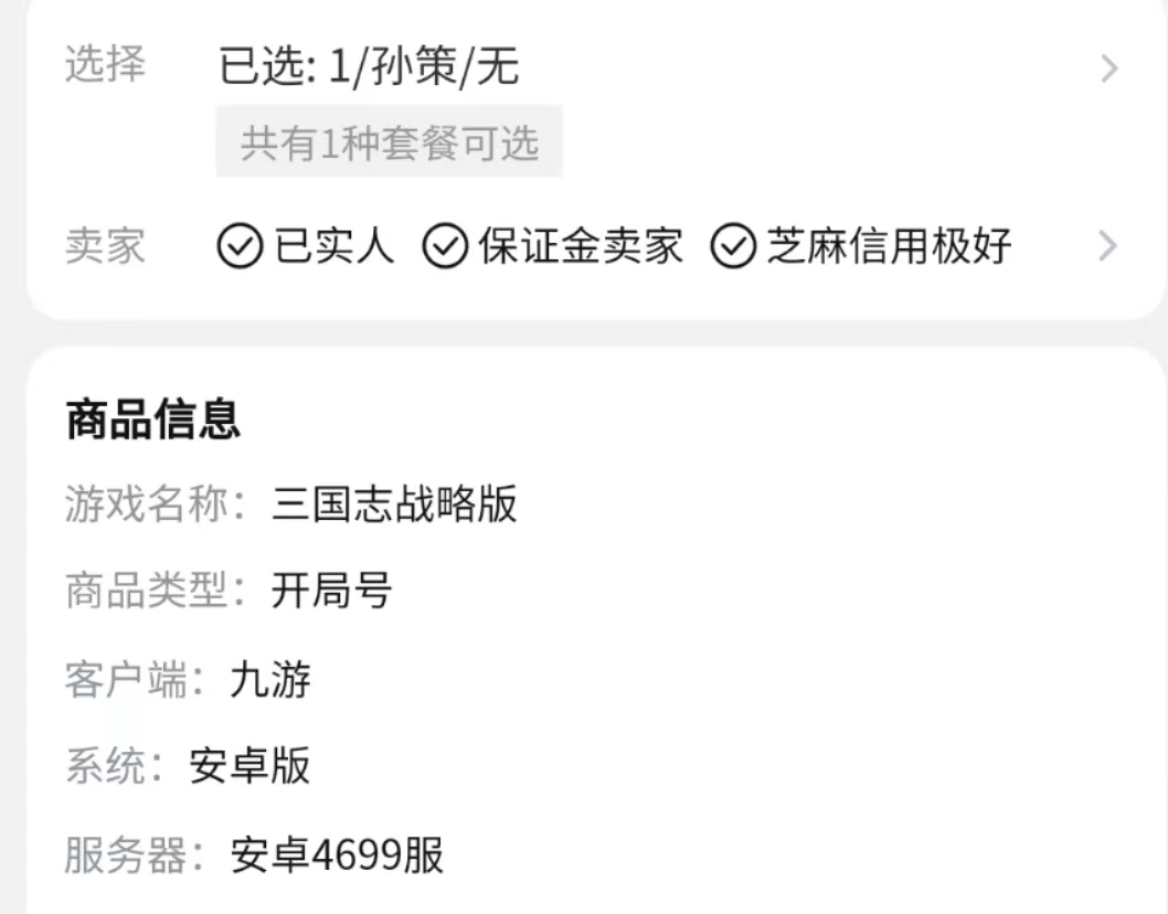 玩家们在交易猫上搜索这款游戏,在筛选中选择开局号就能看到当下能够在交易猫上购买的这款游戏的开局号。开局号的价格一般较低,如果没有武将需求的话在1-5元之间,如果有武将要求的话价格会上涨些,在5-50元之间,具体看武将的品质。别看开局号的价格低,但是交易猫上对于能够售卖这类账号的卖家有着严格的要求,需要卖家是保证金卖家,保证金卖家的审核会比个人卖家的审核更加严格。在挑选开局号时也建议玩家优先寻找保证金卖家。