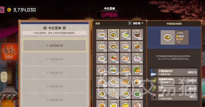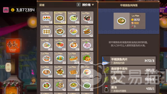 分店中可以出售的食物种类有很多,主要是以寿食为主,比如鹰嘴鱼寿司、虎鲨寿司、海葡萄寿司、巨口鲨寿司,这些寿司类型的食物都可以给玩家带来很不错的收益。