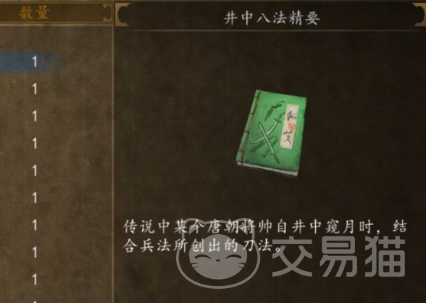 以上就是关于侠客风云传前传井中八法怎么获得的一番说明,是可以提升1点刀法属性的精要,别看只有1点,但很多类似加刀法属性的秘籍累计在一起就能有不小的提升,大家如果漏掉了这个任务,不妨去试一试吧!