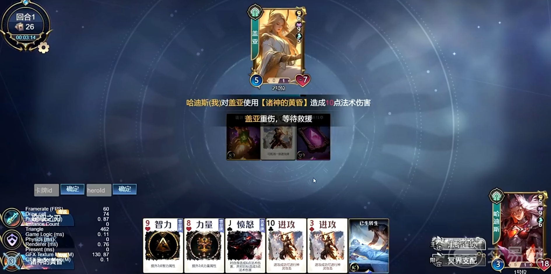 然后这样循环反复以此类推,直到其中一方的血量归零或认输,则游戏结束。间各位可以运用自己的策略知识,在基础的公共卡牌和自己构筑的装备和技能卡牌当中找到平衡,最大限度的发挥自己神灵的战斗力和特点,成为这场诸神竞技场最后的赢家。