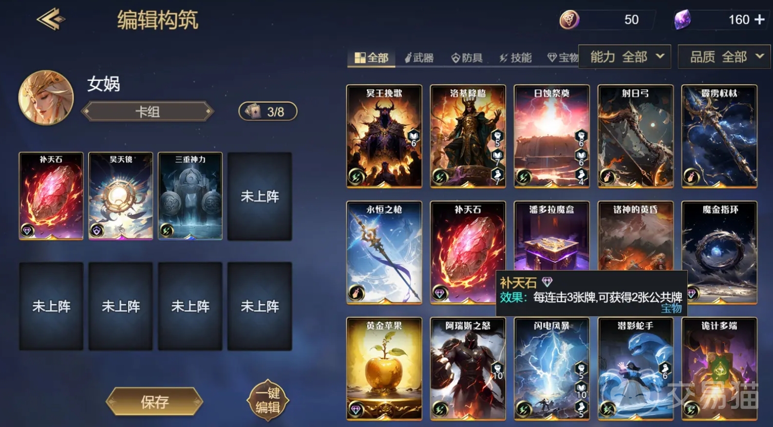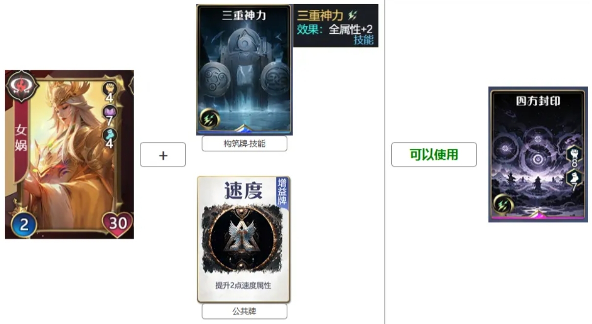 比如说我们这张卡女娲它的三维属性有4点力量7点智力和4点敏捷,而四方封印这一张强力的技能卡则是需要8点力量和7点敏捷,因此一般情况下我们能力不够便无法使用。但是如果我们在此局当中如果打出某些加属性的卡牌,例如这种三重神力全属性加2的技能效果以及速度这种基础的公共牌效果,那么我们的三维属性就会变成8点力量、9点智力、8点敏捷,达到了使用卡牌的要求,便可以使用这张卡牌效果。