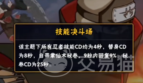 这个最近火爆的4秒cd模式就是在不公平对战的技能决斗场,在这个主题里的所有忍者的技能冷却时间都是4秒,替身的话则是8秒,而且自带仙术秘卷,在9秒内能恢复9%,而秘卷的冷却时间是25秒。