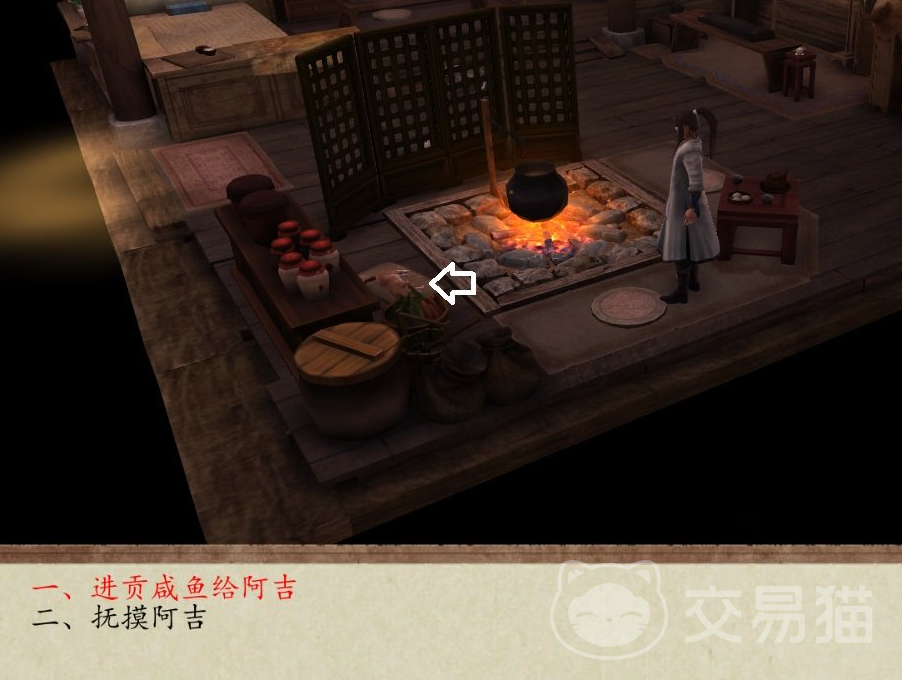 在拿到咸鱼之后,我们需要返回到最初的第一间屋子内,这个屋子就是无瑕子右边的屋子。在进入之后,我们直接走到火堆旁边,这样便可以触发剧情,引来了阿吉这个猫咪。在这里有两个选项,我们选择将咸鱼给予阿吉。