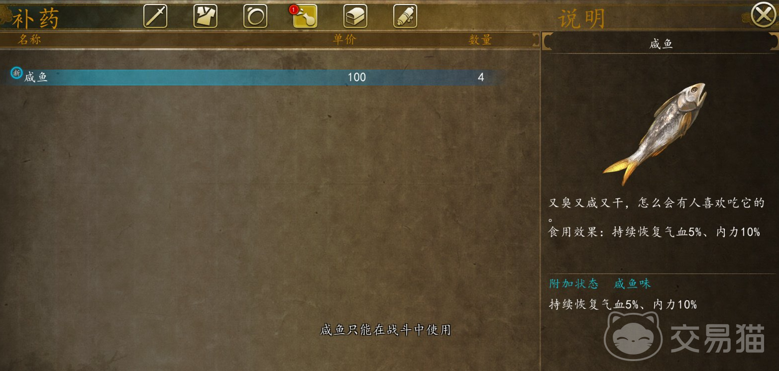 咸鱼干本身在食用之后可以获得持续恢复气血和内力的效果。附加能力则是可以持续的恢复气血和内力。我们在找到咸鱼之后不要直接食用,这些触发调皮猫任务的关键道具。我们没有这件道具的话就没法触发这个支线了。