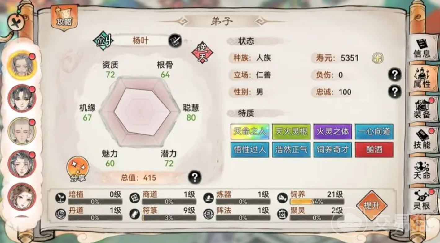在游戏中,弟子品质的最高峰是红色仙缘逆天弟子,他们的潜力与六维属性息息相关,六维数值越高,代表他们的培养前景越广阔。如果你对某位弟子情有独钟,不妨通过丹药喂养来强化其六维属性。一旦某位弟子的综合数值达到365点,他将蜕变为独一无二的逆天弟子,展现出惊人的成长力。