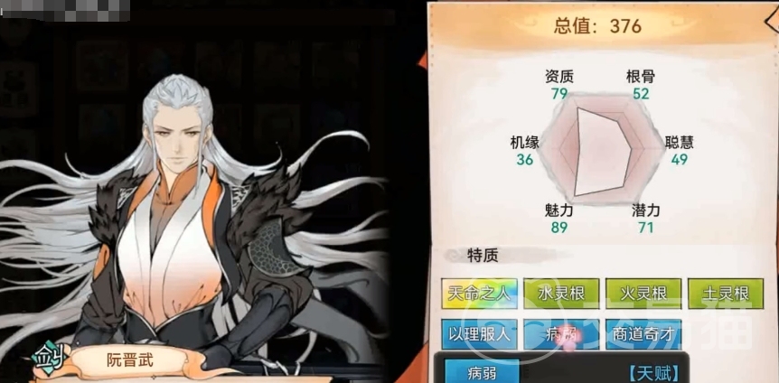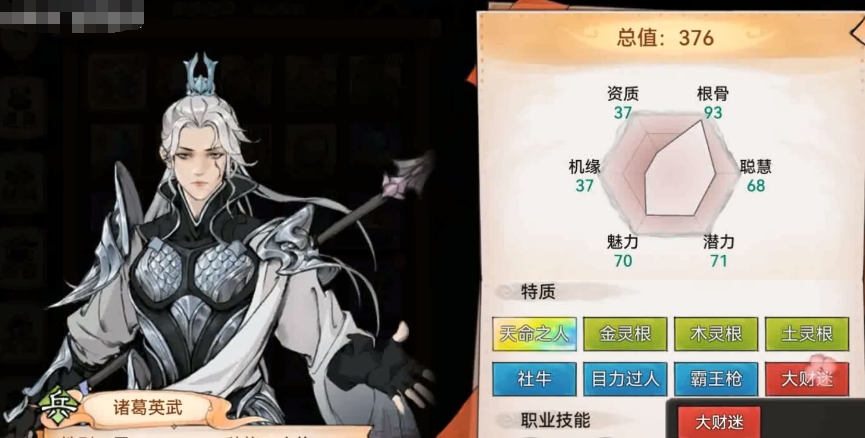 这个弟子一样也是一个人族的逆天弟子,在基础的天赋上面其实跟骨的数值很高,但是资质上面的数值就比较差,但是他最主要的用处其实还是在开荒上面,因为他基本的几个特质都是偏向于开荒的天赋,比如灵根上面就是拥有金灵根、木灵根以及土灵根,不管是用来种植灵草还是去炼丹都是不错的选项,而且本身还是自带了一定的社牛属性,目力过人的同时可以带来更多的资产加成,因为他还有一个大财迷的效果加成,战斗上面一样也可以利用霸王枪给大家带来更多加成的哦。
