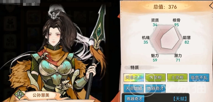 这个逆天弟子一样也是一个女性角色,但是她的作用就比较偏向于战斗,所以很多新手玩家其实是比较推荐大家选择她的,在基础的资质上面也是跟骨奇佳的,在灵根上面虽然只有火灵根跟土灵根,但是在效果上面非常不错,比如临危不惧的效果可以让她在生命低于30%的时候效果抗性提升,而天资聪颖也可以带来5点的聪慧数值,最后的炼器器材天赋则是可以在炼器的时候获取20%的额外经验哦。