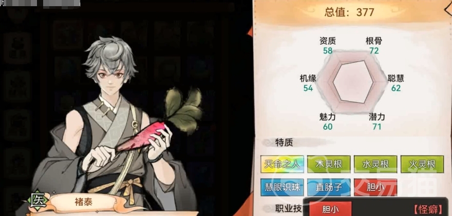 这个弟子虽然是男性人族弟子,但是其实在使用上面是比较偏向于奶妈的,所以在技能上面也是一些恢复技能,整体的资质都是比较平均的,在灵根上面拥有木灵根、水灵根以及火灵根,而在天赋上面有着慧眼识珠这个天赋,这个天赋在上面是根据他使用的武器来产生效果的,如果使用的武器是宝珠在上面就可以保证自己的治疗效果增加10%,直肠子这个天赋则是可以帮助减少丹药上面的消耗,最后的胆小天赋则是可以让大家在上面使用褚泰的时候站在后排提升自己的速度效果。