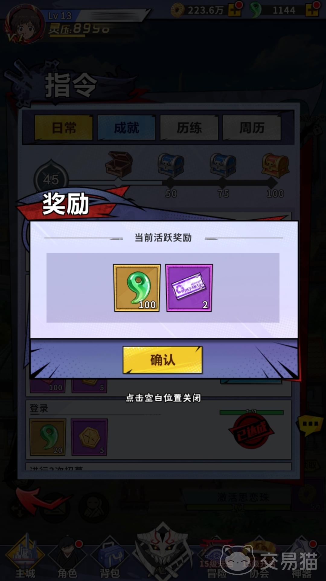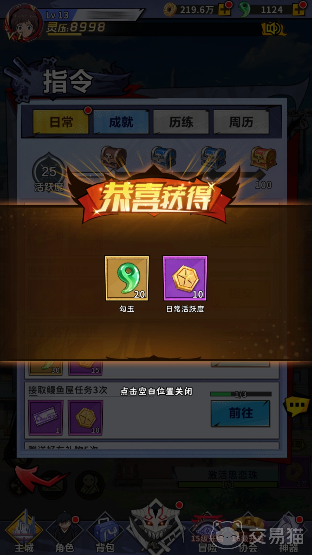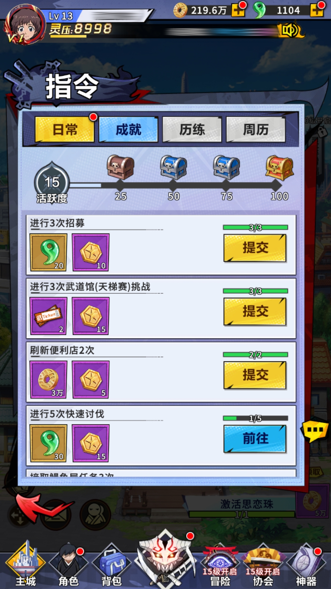当玩家开启指令菜单后,便能解锁日常任务的玩法。里面的任务都较为简单,例如要求玩家招募3次,进行3次武道挑战等,只要玩家当天已经进行了这些项目,便可直接完成。同时,每当玩家完成一项日常任务,均会获得一定数额的活跃度积累,只要积累的活跃度到达相应要求,便可直接领取当日的活跃度宝箱。