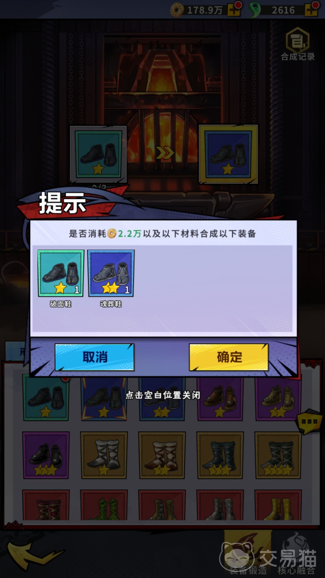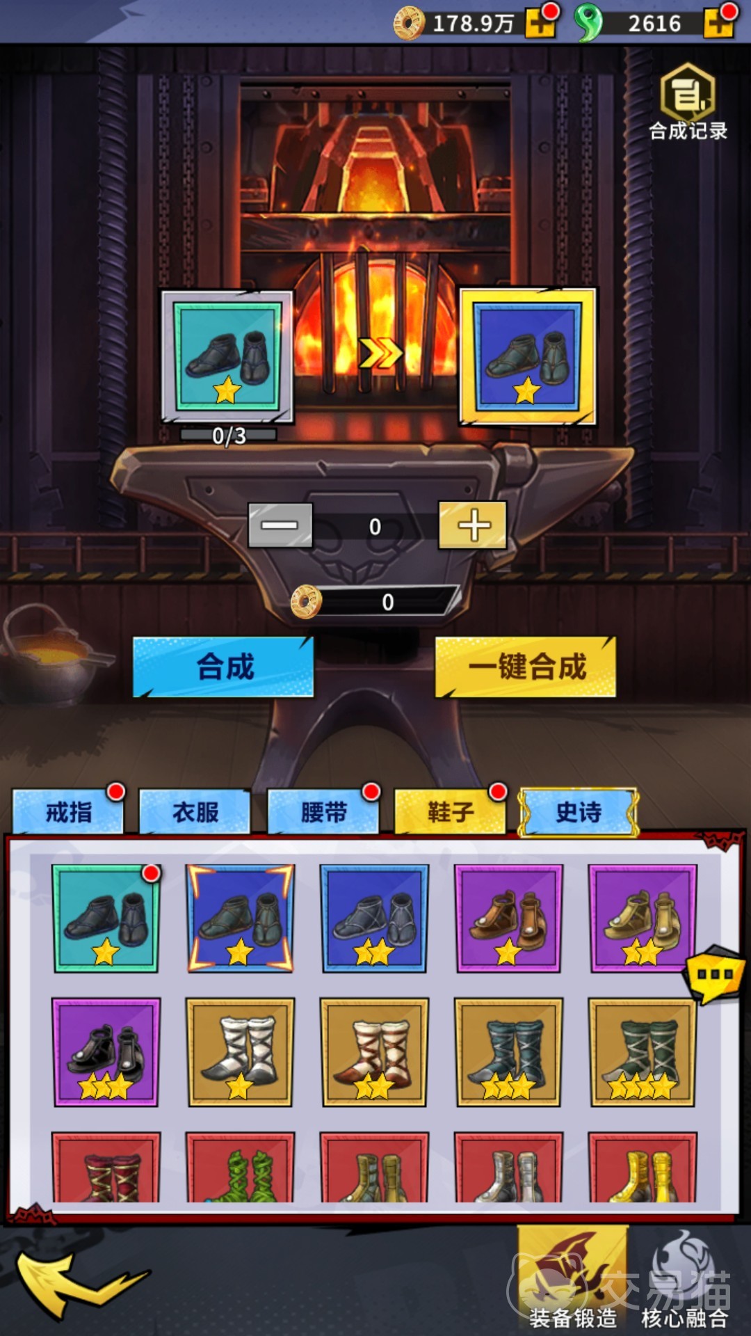 当玩家获得的装备足够多时,可通过锻造屋来完成装备合成,将低品阶的装备合成高品阶。合成一个高品阶装备需要花费一定的金币,以及需要三个低一阶的装备作为材料,最高能合至史诗品质。