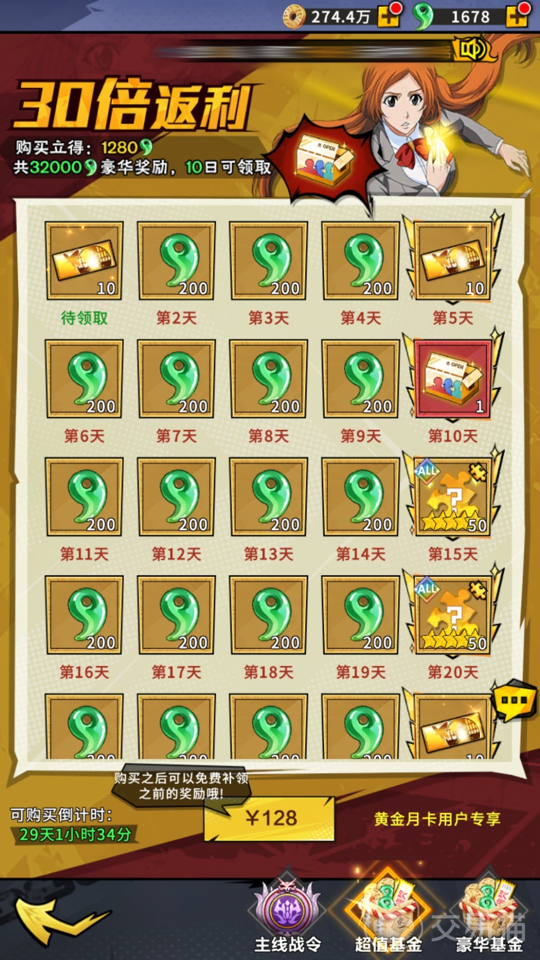 另一个超值的氪金项目就是基金了,虽然购买基金后需要连续登录一个月才能获取全部的收益回报,但基金所给予的福利奖励非常诱人,既有勾玉、金票,还有比较稀少的橙色碎片,能让玩家前期发展得更为迅速。此外,基金共有超值基金和豪华基金之分,两者可一并购买,或挑选其中之一进行购买。