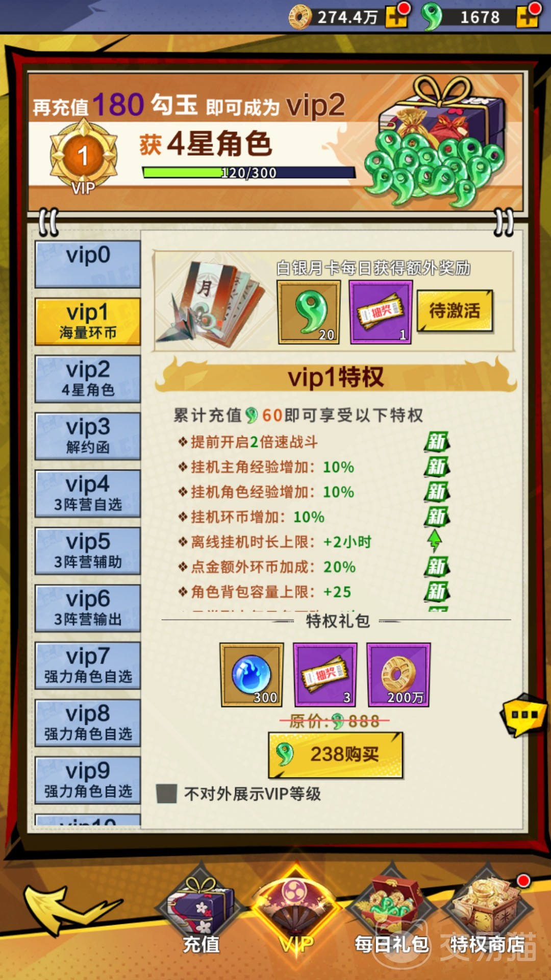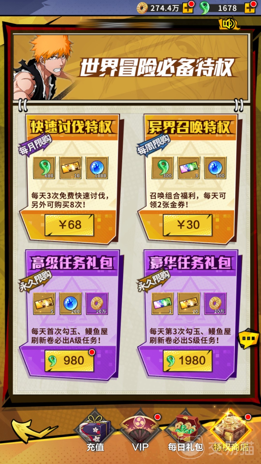 当玩家购买了蓝染礼包和基金后,还可根据自己的VIP等级购买相应的礼包和特权礼包,这些礼包所给予的资源和特权都相当的实用,能让玩家的游戏之旅变得更为顺畅。剩下的礼包则比较专,例如角色礼包、金票礼包等,玩家可按需进行购买。