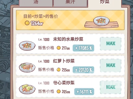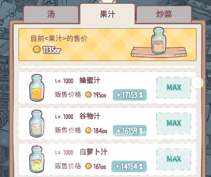 其次就是果汁,在游戏中后期会比较好卖,果汁的食谱开发就比汤简单的多了,像是玉米汁、胡萝卜汁、各种果汁等等,大家都能做出来。最后就是炒菜了,炒菜的菜谱是比较麻烦的,但是前中期大家发展这个菜谱的话很好卖,可以尝试水果炒菜。