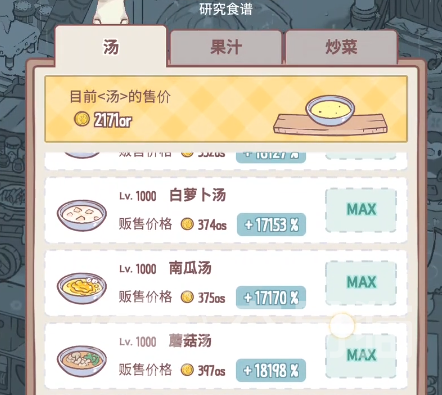 游戏里的汤的等级还能提升,价格和品质也会变化,所以研发出来之后大家还可以想办法升级这些,提升了之后能买的价格高了,赚钱的速度就快了,高品质还能收获不少好评。
